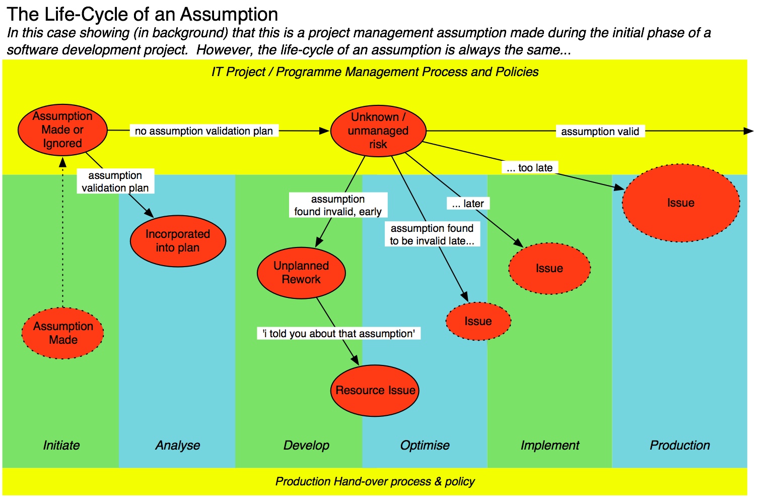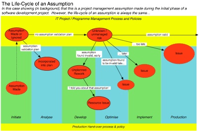 Early in my career I had an experience in managing assumptions that has stuck with me. Many years ago, as a young computer programmer, I complained to my team leader that I didn’t have enough information to design a change in an application I had been asked to write. I was told by the my team leader to proceed with my design, complete it by the milestone date, and to document all my assumptions. All of which I proceeded to do. It was frustrating because many of the assumptions I was documenting seemed to be nit-picking and simple enough to solve issues if I only knew who to talk to. The problem was, when I presented my completed design to the customer he didn’t read anymore than the first few pages - the rest of the document was ‘too technical’ (it wasn't really - but that’s another article). When he got to the list of assumptions that had allowed me to complete the design on time and said: ‘I see these assumptions. I’m not sure they are valid. What is your assumption validation plan?’ I hated that phase when I first heard it. 'What is your assumption validation plan?' To me, creating the list of assumptions was already more time than I wanted to spend on these issues. I was a programmer, so I was wondering - like many new programmers do - why I had to do all of this documenting when I should be coding. Step forward 15 years or so and I no longer wonder why we need to do all of this documenting when we should be coding. But this problem wasn't solved by changing developers, it was solved by specialisation. The IT industry has matured to the point where most organisations try to have separate designers, business analysts, project managers, architects, etc so programmers can get on with the business of coding - and so that the quality of the documentation is improved through specialisation. But for all the change in the IT industry many things in management remain the same. I now understand the question ‘What is your assumption validation plan?’ to be one of the most insightful questions in general management. The question 'What is your assumption validation plan?' recognises that assumptions themselves have a life-cycle and that they must be managed. It also recognises a more important point that assumptions have a history! It is a question that skips over the dubious discussion about why somebody took the time to raise this assumption, and proceeds directly to what we are going to do about it now. Asking this question stops assumptions being used as a ‘out’ from having to deal with an issue. An assumption validation plan is more work - work that still needs to be done - and perhaps even work that could have been avoided if the assumption hadn’t been made. Making assumptions simply allows work to proceed now by defering other work (and possible re-work) to later. It's a useful tool. But only if you remember you have defered work and manage that future effort. But the management profession being what it is, when it comes to the crunch and somebody complains that they don’t have enough information to proceed I still often hear ‘Proceed with your design, complete it by the milestone date, and document all of your assumptions…’ In fact, I think I hear this even more often. But I almost never hear 'What is your assumption validation plan?' or 'This is our assumption validation plan'. And it’s not just programmers. It seems project managers, designers, business analysts, and architects are getting the same advice - 'Proceed with your work - and document all your assumptions...' Somewhere in the world, there is a bunch of work building up that nobody is managing! The lesson I learnt from that early experience was to not make assumptions. I don’t mean not to state my assumptions - I mean not to make assumptions in the first place. My approach is to either find the upstream deliverable that needs to be developed or updated so the assumption doesn’t need to be made. Also, all documents I produce that might otherwise contains ‘assumptions’ instead contain clearly identified sections for issues and decisions that need to be managed. By the time the document is completed these issues are resolved, the decisions are made, or the decisions are with the very people who the document is being delivered to. Over the years I’ve come to realise that the ‘assumptions’ shtick, like many concepts that start out as good management practice, has been co-opted by managers to serve nothing more than the managers own interests. As always, with managers under time pressures, impossible demands, and gaps in knowledge - just like the rest of us - they are forced to utilise management words to protect their own interests.